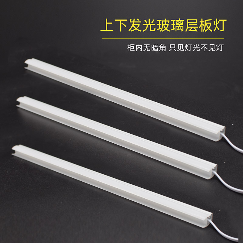 这是一款三面发光的玻璃层板灯,它的光线可以向上、向下及横向穿透层板往外发散,从视觉上来看是看不到灯具的,只能看到整个层板在发光,让家具的一部分变成发光体,既节省空间又显得高级。