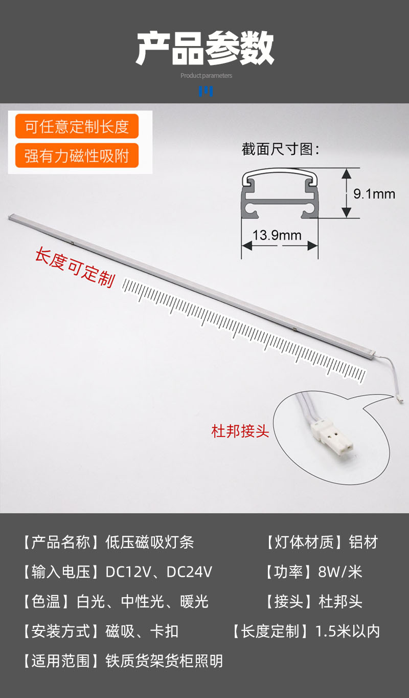 这一款低压DC12V磁吸货架灯,是专门为面包架及货架照片研究的灯条。适用各种铁质货架、货柜、柜内照明的低压灯条,而且重要的一点是它具有磁吸功能,可以直接吸附在货架上,想放哪就放哪,特别方便。